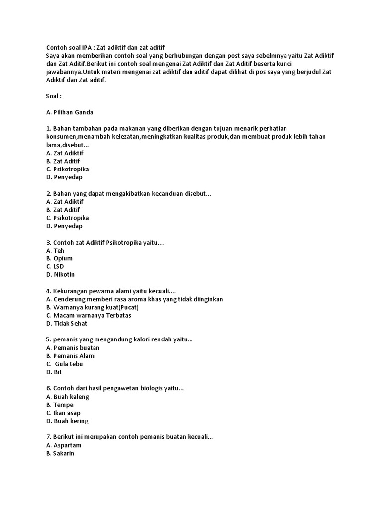 Soal Ujian Zat Adiktif Smp Kelas 8 Doc Galeri Siswa from imgv2-1-f.scribdassets.com Zat aditif dan adiktif disusun oleh nama nur ajeng suna. Demikian informasi yang dapat kami bagikan mengenai contoh soal zat aditif dan adiktif beserta jawabannya. May 25, 2021 · contoh soal zat aditif dan adiktif beserta jawabannya. Soal zat adiktif dan psikotropika dengan pembahasannya riolan. Kami membas soal zat aditif dan adiktif lengkap untuk anda bisa pelajari langsung nantinya, sehingga bisa membatu pelajaran buat anda semua. B sekian kumpulan soal zat aditif zat adiktif dan psikotropika untuk level aplikasi sesuai kisi kisi ujian nasional terbaru. Contoh soal zat aditif pada makanan lengkap dengan jawabannya ini berbentuk pilihan ganda dengan jumlah 20 butir soal. Penyusunan soal ujian sekolah berstandar nasional pusat penilaian pendidikan badan penelitian dan pengembangan kementerian pendidikan dan kebudayaan.